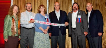 Presenting the Award for Use of Information Technology in Education to the Hawaii Chapter are (l-r) Natalie Givans, AFCEA Chair of the Board; Ed Ryglewicz, Regional Vice President, Pacific Region; Cynthia Pachecho, Chapter President; ADM Richard Macke, USN (Ret.); Fred Rainbow, Vice President and Executive Director of the AFCEA Educational Foundation; and Kent Schneider, President and CEO, AFCEA International.