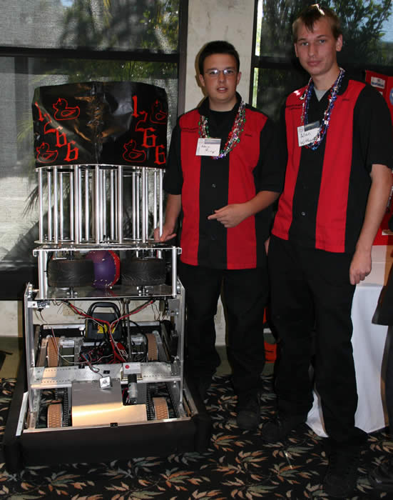 Student members of the 'Devil Duckies' Robotics team from Madison High School, San Diego, California, stand with their robot during