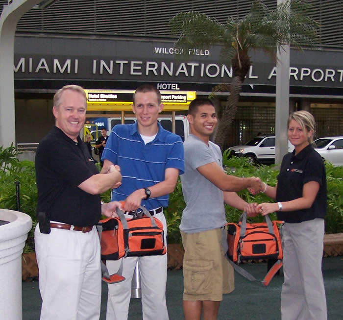 | Mr. Mark Nehmer (l above), Vice-President for Education, and Melissa Nelson, AFCEA South Florida Chapter, extend a warm Florida welcome to Midshipmen Jonathan J. Messer, Boston University, (c-l) and Jay C. English, Savannah State University, (c-r) as they arrive for their week-long ROTC Experience Tour at the U.S. Southern Command, Miami, Florida, in June. Midshipmen Messer and English were sponsored by ADM James G. Stavridis, Commander, USSOUTHCOM. The Experience Tours will be offered again this year - click here for more information about the program. |