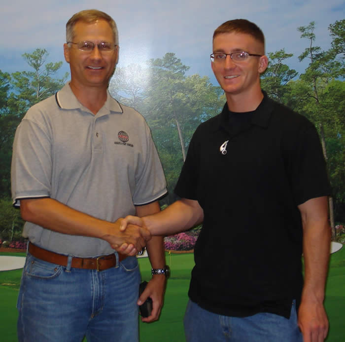 | Mr. Joseph Yavorsky, Augusta-Fort Gordon Chapter President, welcomes Army ROTC Cadets Joseph H. Izraelevitz, (l) Washington University in St. Louis, and Drake E. Brewster, (r) Western Illinois University, upon their arrival for their week-long ROTC Experience Tour at the U.S. Army Signal Center, Fort Gordon, Georgia, in August. The Cadets were sponsored by BG Jeffrey W. Foley, USA, Commanding General, U.S. Army Signal Center. |