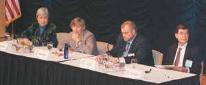 | Describing the new federal employee and contractor credential program were panelists (l-r) Mary Dixon, deputy director, Defense Manpower Data Center; Judy Spencer, chair, federal identity credentialing, General Services Administration; Neville Pattinson, director of business development, technology and government affairs, Axalto Incorporated; and Curt Barker, co-chairman of the personal identification verification project, National Institute of Standards and Technology. |