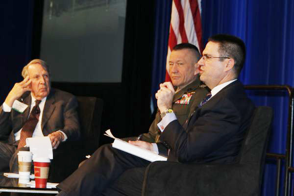 Panel moderator Vice Adm. Herbert A. Browne, USN (l), listens as panelists (l-r) Lt. Gen. Jon M. Davis, USMC, deputy commander of the U.S. Cyber Command; and Robert J. Carey, deputy chief information officer for the U.S. Defense Department, discuss key cyber issues.