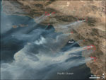 | This satellite image of Southern California wildfires was generated by the National Geospatial-Intelligence Agency (NGA) as a composite with descriptive overlays. Infrared hot spots that betrayed actual fires are highlighted in red. The NGA used new intelligence community virtual collaboration services to generate and distribute the images from its St. Louis facility to firefighters on the ground in the affected areas. |