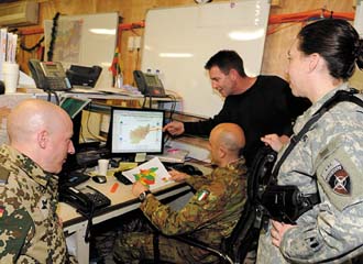 Capt. Oliver Loritz, GE A (l), a regional analyst; Maj. Andrew Carbonaro, ITAR (2nd from l), governance analyst; Ric Diaz (2nd from r), an analyst for Pakistan issues with the U.S. Defense Department; and Maj. Justine Krumm, USA, Information Dominance Center (IDC) production chief, International Security Assistance Force (ISAF), collaborate on a project. The IDC harnesses civil and military expertise and serves as a multinational information center. |