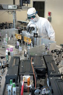| A technician at Northrop Grumman’s Space Technology sector checks diagnostic instruments used to monitor infrared laser beams fired by the company’s laboratory demonstrator for the U.S. military’s Joint High Power Solid-State Laser (JHPSSL) program. Successful tests have paved the way for scaling up the solid-state laser from 27 kilowatts to an eventual goal of 100 kilowatts. |