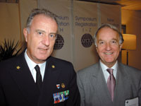 Adm. Ferdinando Sanfelice di Monteforte, ITN (l), commander, Allied Forces Southern Europe, and Cdre. Robert Howell, RN (Ret.), AFCEA Europe general manager, converse at TechNet Europe 2003. |