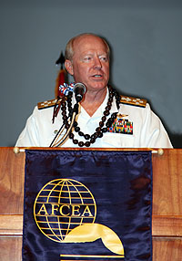 ![]() Adm. Robert F. Willard, USN, commander of the U.S. Pacific Command, warns the audience at TechNet Asia-Pacific 2010 of the threat to cyberspace. |