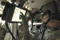 | A U.S. Air Force senior airman embedded with an Army unit in Iraq enters coordinates into a Stryker assault vehicle system as part of his mission as a joint terminal attack controller. The Army has worked within the joint community as it strives to expand network capabilities. |