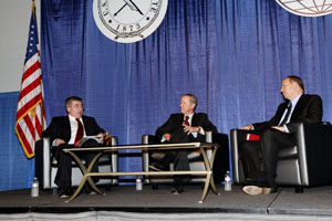 | Discussing issues surrounding the new Air-Sea Battle concept are (l-r) panel moderator Lt. Col. Frank Hoffman, USMCR (Ret.), former senior director, Naval Capabilities and Readiness, Office of the Deputy Undersecretary of the Navy and director, National Defense University Press; Adm. Patrick M. Walsh, USN (Ret.), former commander, U.S. Pacific Fleet; and Lt. Gen. David Deptula, USAF (Ret.), former deputy chief of staff for intelligence, surveillance and reconnaissance, U.S. Air Force. |