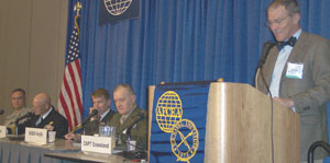 ![]() | Capt. Roger Crossland, USNR (r), introduces a panel on special operations forces and the support they need. Panelists are (l-r) Col. Edward Reeder, USA, commander, 7th Special Forces Group (Airborne); Capt. Sean A. Pybus, USN, commander, Naval Special Warfare Group One; Erik Prince, president and chief executive officer, Blackwater USA; and Brig. Gen. Dennis J. Hejlik, USMC, commander, Marine Corps Special Operations Command. |