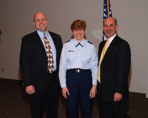 ![]() Discussing chapter business at the March luncheon are Dave Hart, chapter president (l); Lt. Gen. Janet Wolfenbarger, USAF; and Dan Curtis, chapter vice president for programs. |